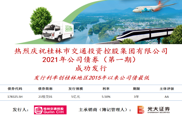 2021年4月9日,桂林交通控股集团乐成刊行2021年第一期5亿元公司债券,刊行利率创桂林地区2015年以来公司债最低。